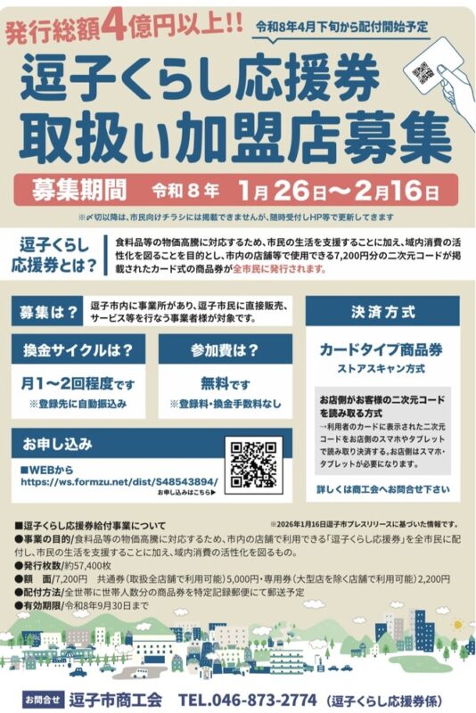 取扱い加盟店を募集しています 投稿日 2026年1月27日 更新日 2026年2月17日 著者 逗子市・逗子市商工会 カテゴリー ニュース 詳細は以下のチラシをご確認ください。 お問い合わせ:逗子市商工会(逗子くらし応援券係)046-873-2774 申込フォーム(外部リンク) 共有: Facebook で共有 (新しいウィンドウで開きます) Facebook X で共有 (新しいウィンドウで開きます) X この記事を書いた人 逗子市・逗子市商工会 記事一覧
